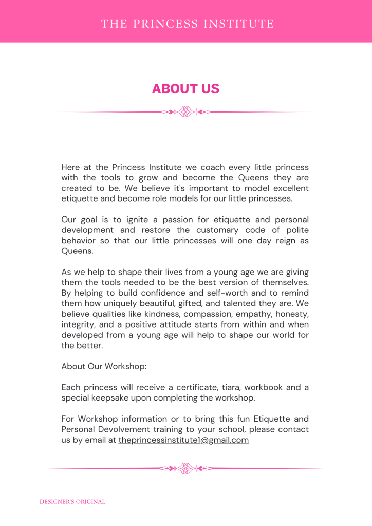 With these educational series, Andria’s goal is to ignite a passion for etiquette and personal development and restore the customary code of polite behavior so that our little Princesses will one day reign as Queens.